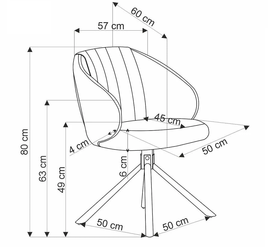 - Wymiary: szerokość - 57 cm, głębokość - 60 cm, wysokość całkowita - 80 cm, wysokość od podłoża do siedziska - 49 cm