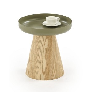 Naturalność spotyka nowoczesność w postaci stożkowej nogi wykonanej z płyty MDF pokrytej autentyczną okleiną, której wyraźny rysunek drewna przypomina o bliskości natury. Kontrastuje z nią oliwkowy, matowy blat wykonany z malowanej proszkowo stali – materiału, który nie tylko nadaje charakteru, ale również gwarantuje niezrównaną trwałość i odporność na zarysowania. Ta harmonijna fuzja materiałów sprawia, że stolik kawowy Dina staje się nie tylko funkcjonalnym meblem, ale również wyrazistym akcentem designerskim. Z kompaktową średnicą 40 centymetrów, Dina zajmuje idealną przestrzeń – wystarczającą, by pomieścić filiżanki, przekąski czy ulubioną książkę, a jednocześnie na tyle dyskretną, by swobodnie manewrować w bardziej kameralnych wnętrzach. Solidna konstrukcja na pojedynczej nodze zapewnia stabilność, jednocześnie nadając całości lekkości wizualnej, która jest tak pożądana we współczesnych aranżacjach.