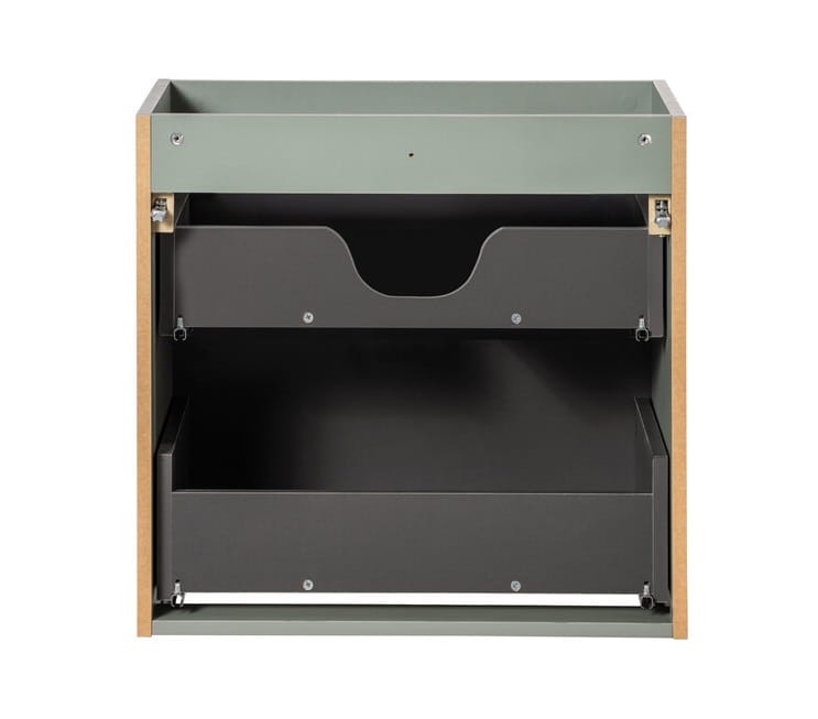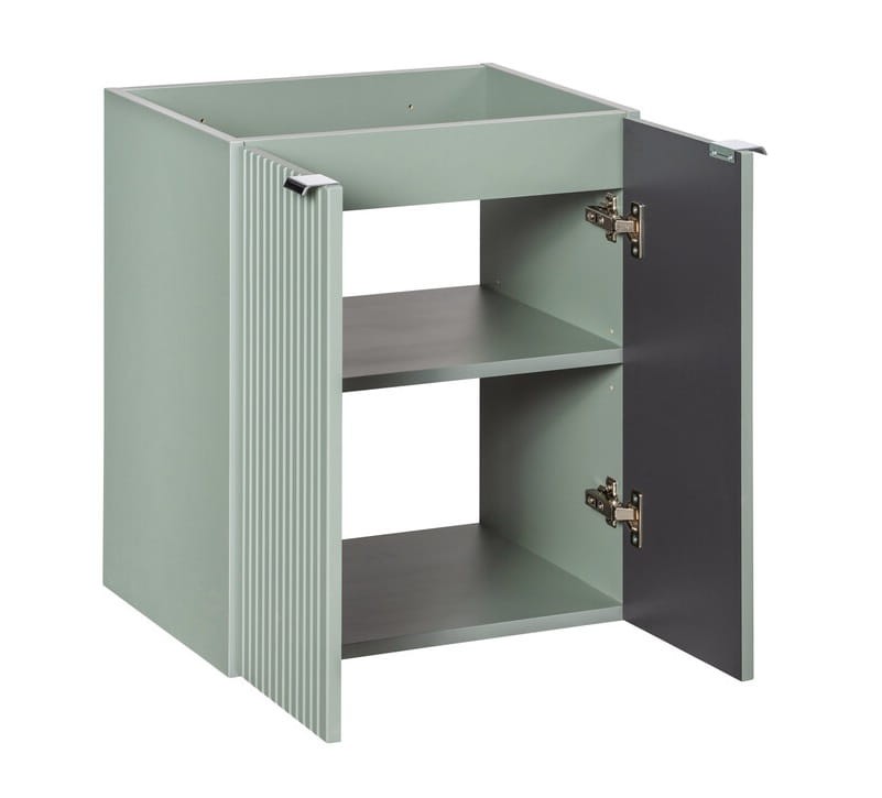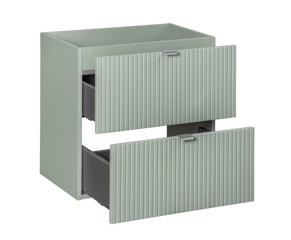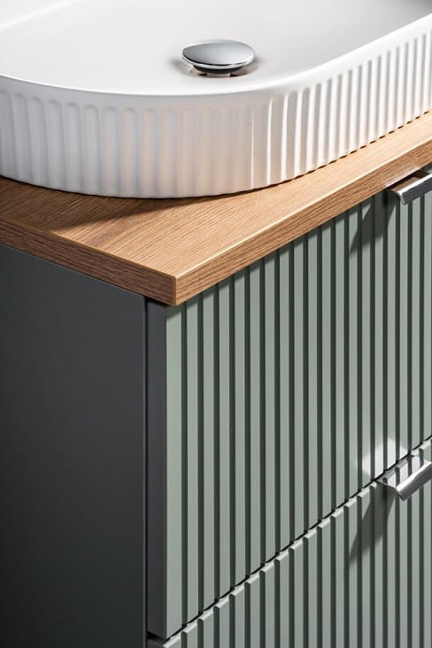 Sercem zestawu są dwie szafki podumywalkowe o szerokości 60 cm, połączone eleganckim blatem w kolorze dąb evoke, który wprowadza do wnętrza naturalny akcent i ciepło drewna. Fronty mebli zachwycają subtelnym, szałwiowym odcieniem oraz precyzyjnie wykonanymi, pionowymi ryflowaniami, które nadają całości niepowtarzalnego charakteru. Pierwsza szafka, wyposażona w praktyczne szuflady, pozwala na wygodne segregowanie kosmetyków, podczas gdy druga - z systemem półek - oferuje przestrzeń do przechowywania większych akcesoriów łazienkowych. Dopełnieniem zestawu są dwie luksusowe umywalki ceramiczne o owalnym kształcie, których marmurowy design dodaje całości ekskluzywnego charakteru. Srebrne, metalowe uchwyty harmonijnie komponują się z nowoczesną stylistyką mebli, a system cichego domyku zapewnia komfortowe użytkowanie na co dzień.