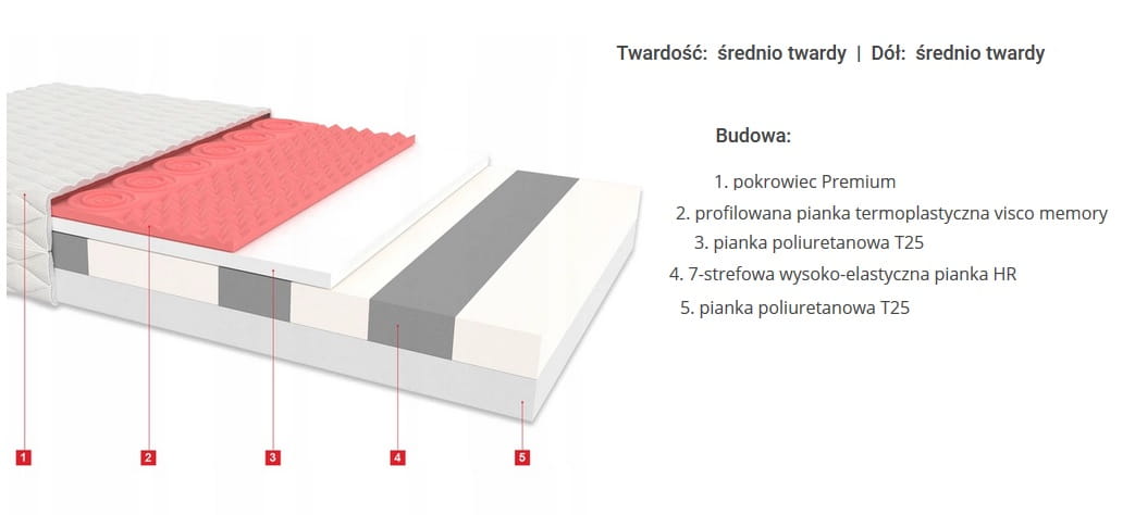 W środku materaca znajduje się pianka wysoko-elastyczna HR, która dzieli materac na 7 stref, zapewniając doskonałe podparcie kręgosłupa. Posiada niejednolitą strukturę komórkową, dzięki czemu uzyskuje lepsze parametry podtrzymywania ciała, komfortu oraz sprężystości. Zapewnia idealne dopasowanie materaca do kształtu ciała, pozostając przy tym niezwykle lekką. Materiał ten wyróżnia się niezwykłą trwałością i odpornością na odkształcenia. Trwałość pianki HR określa się nawet jako o 40% wyższą od tradycyjnej pianki poliuretanowej o tej samej gęstości, dodatkowo odzyskuje ona swój pierwotny kształt dwa razy szybciej. Oznacza to, że o wiele szybciej reaguje na zmianę pozycji ciała, co znacznie poprawia komfort spania. Jest to materiał odpowiedni dla alergików - porowata struktura, zapewnia doskonałą cyrkulację powietrza, co uniemożliwia rozwój grzybów i pleśni.