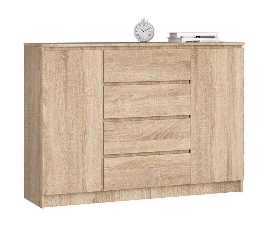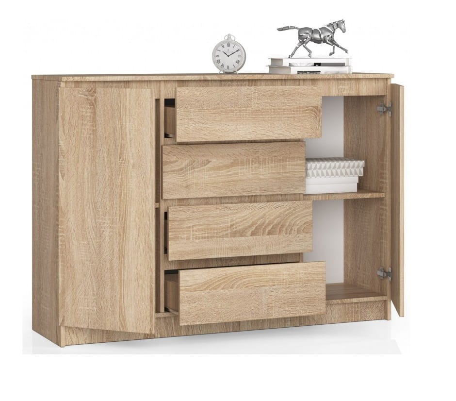 Nasza komoda ma aż 138 cm długości, wyposażona jest w dwie szafki z półką i w cztery praktyczne szuflady. Te poruszają się na innowacyjnych prowadnicach rolkowych, dzięki czemu łatwo się wysuwają i nie generują hałasu. Mebel z płyty laminowanej i zabezpieczony obrzeżami ABS, jest odporny na ewentualne uszkodzenia, a co za tym idzie - wyróżnia się trwałością, co potwierdza długa gwarancja producencka.