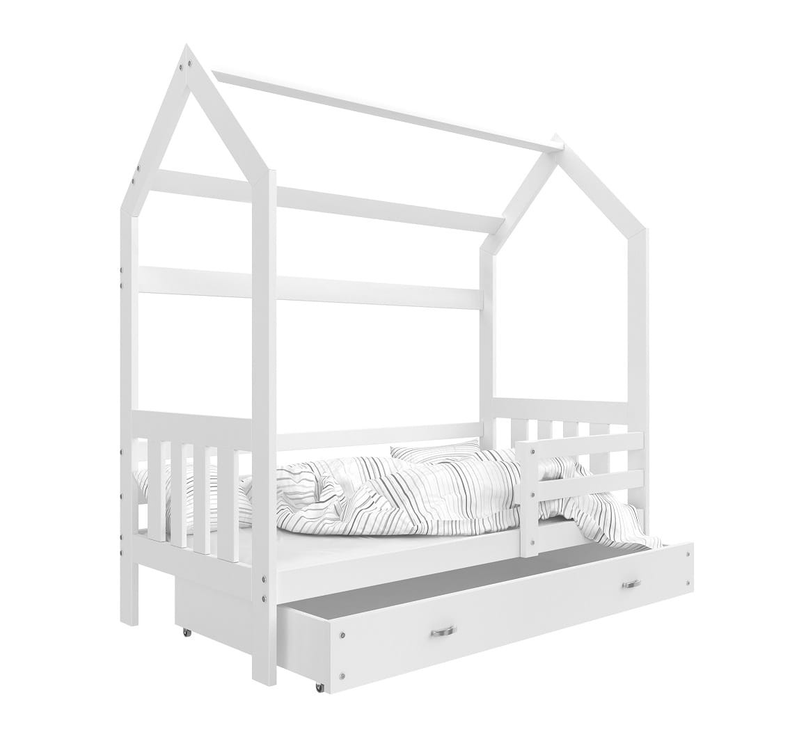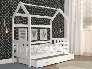 Białe łóżko dziecięce w kształcie domku z szufladą i barierką