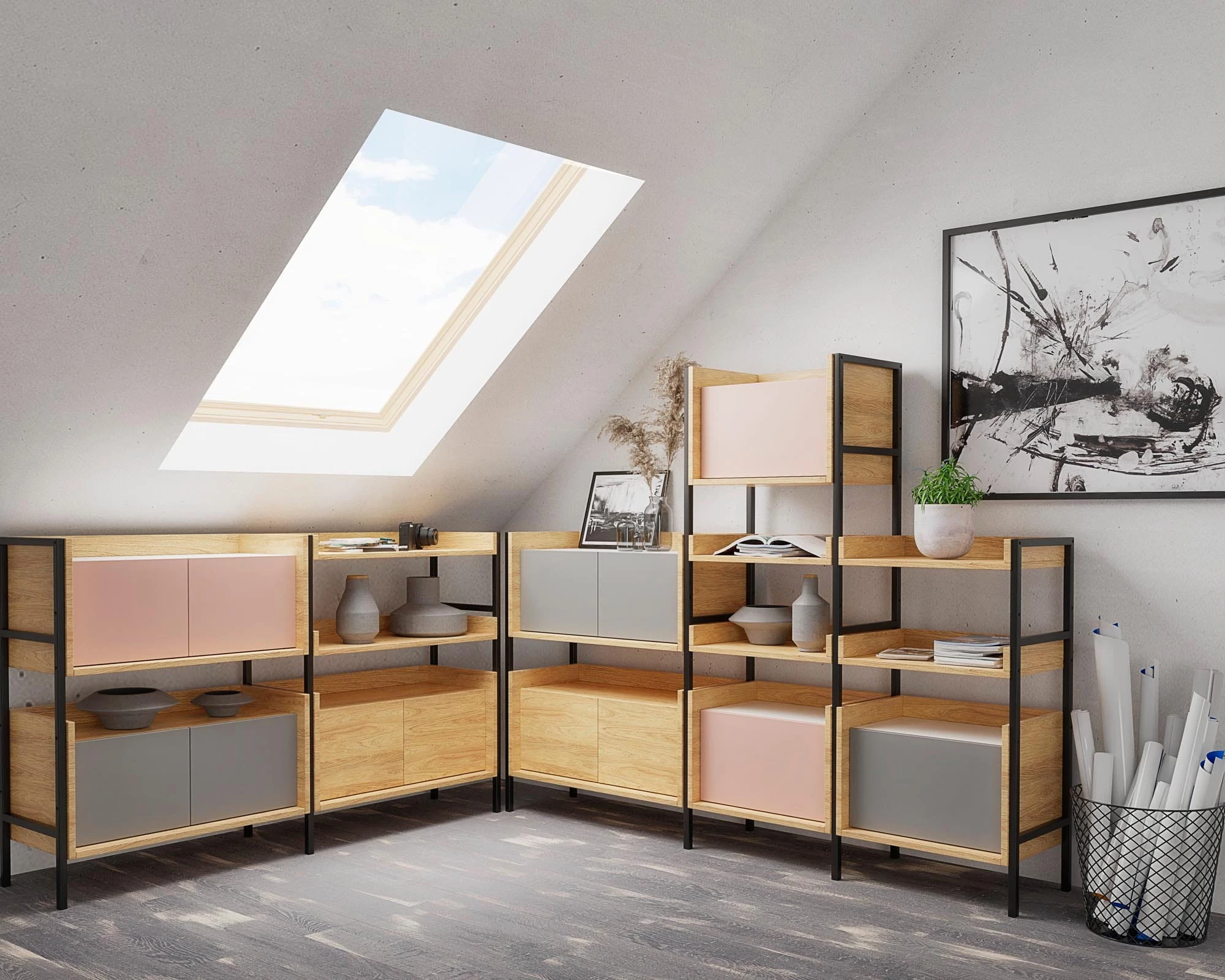 System modułowy Uzo opiera się na stabilnej podstawie, jakie stanowią trzy różne warianty stelaża stalowego, malowanego metodą proszkową. Na ich bazie można stworzyć rozmaite zagospodarowania domowej przestrzeni, przy udziale elementów skrzyniowych.