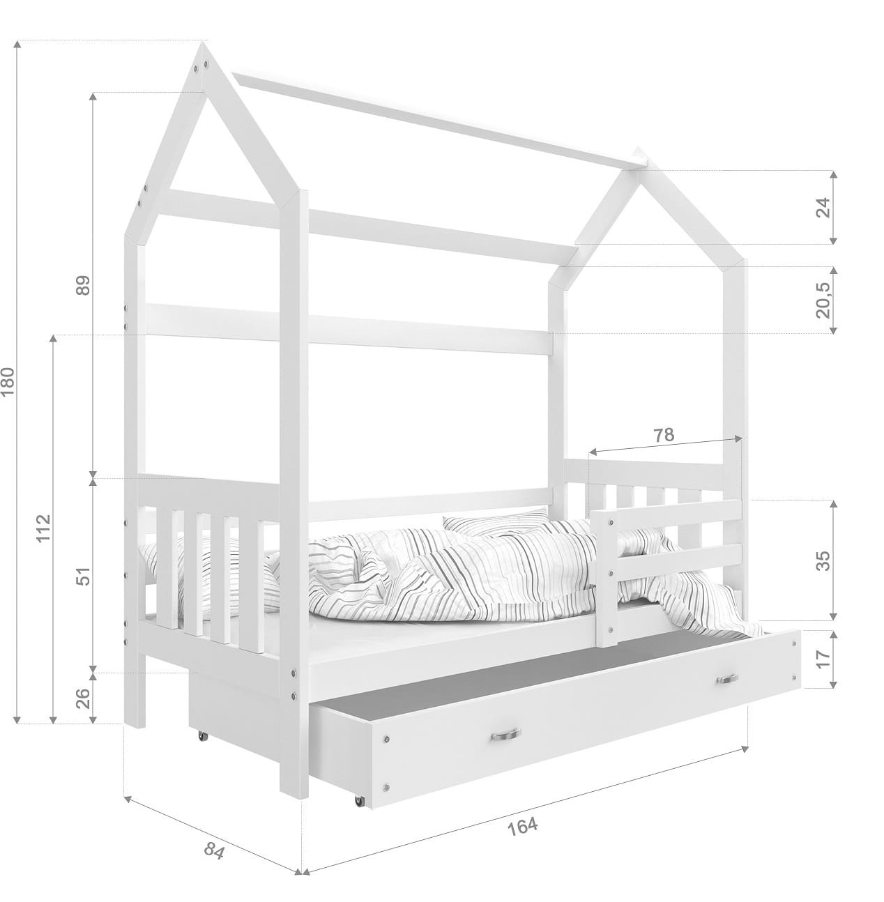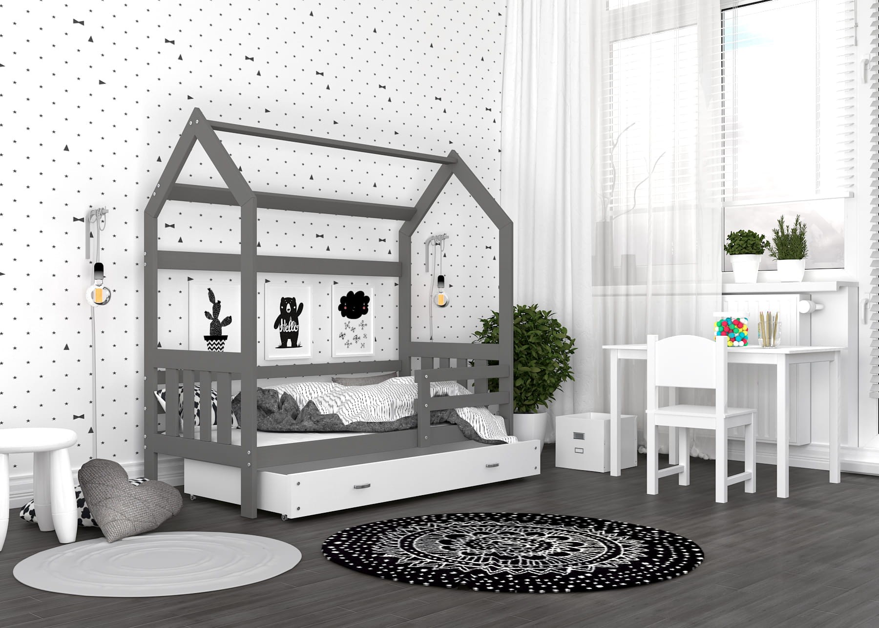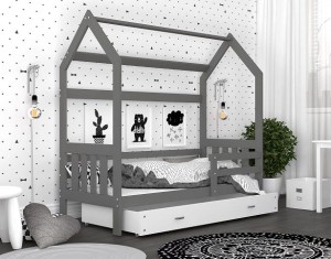 Jednoosobowe łóżko parterowe dla dziecka ma specjalnie zaprojektowaną ramę imitującą kształt domku. Wyposażone jest w głęboką szufladę wysuwaną na kółeczkach. Może posłużyć ona zarówno jako skrytka na pościel, ale też jako funkcjonalny pojemnik na zabawki, który pozwoli zachować ład w dziecięcym pokoju.
