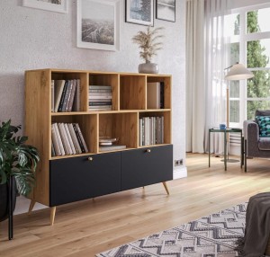 Regał Tempro to nie tylko miejsce na Twoje ulubione książki. Dzięki dwóm rzędom półek zyskasz mnóstwo przestrzeni do wyeksponowania dekoracji, zdjęć czy pamiątek. Dodatkowo, dwie zamykane wnęki z drzwiami otwieranymi ku dołowi pozwalają na przechowywanie przedmiotów, które chcesz ukryć przed wzrokiem gości. To idealne rozwiązanie do przechowywania dokumentów, elektroniki czy innych drobiazgów, które wymagają dyskretnego miejsca.