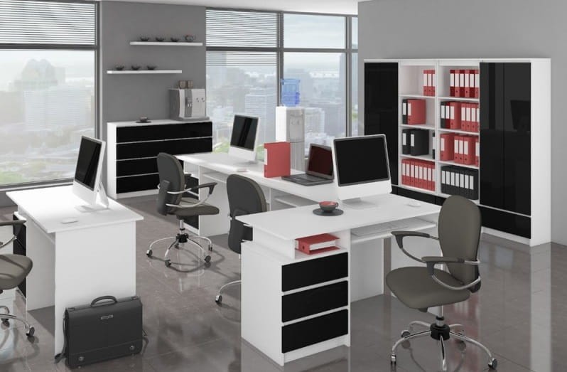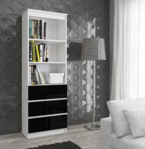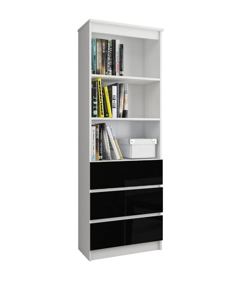 Klasyczna forma biblioteczki wyposażonej w trzy półki w w trzy pojemne szuflady nabiera sznytu dzięki zastosowaniu nowoczesnych materiałów. Korpus mebla stworzony został z odpornej na ścieranie i zarysowania - białej płyty laminowanej. Fronty szuflad, w pełnym blasku kolorze czarnym, zrobiono z z polakierowanej na wysoki połysk płyty MDF. Natomiast krawędzie mebla oklejono zabezpieczającym obrzeżem ABS. Zatem regał ten jest i stylowy i solidny.