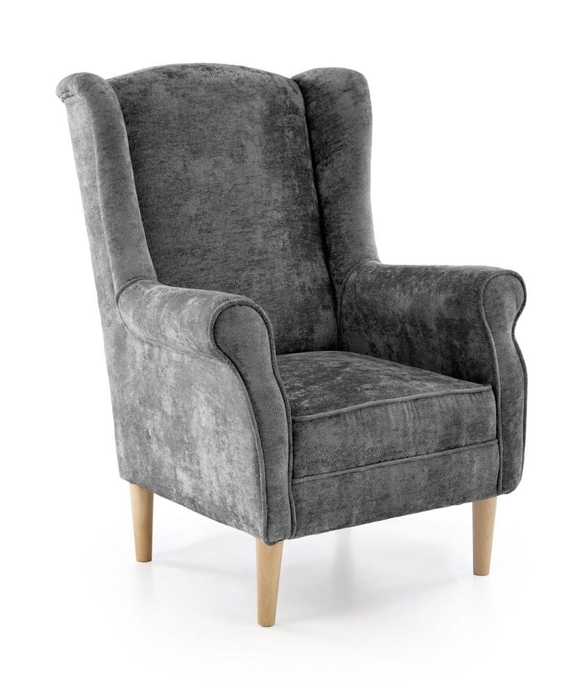 Fotel uszak Herme to kwintesencja skandynawskiego designu - minimalistyczna elegancja spotyka się z maksymalnym komfortem. Głębokie, obszerne siedzisko otula Cię miękką, aksamitną w dotyku tkaniną w głębokim, szarym odcieniu, który wprowadza do wnętrza element natury i spokoju. Ergonomicznie wyprofilowane oparcie idealnie podpiera kręgosłup, a charakterystyczne "uszy" po bokach tworzą kameralną atmosferę, odcinając Cię od zewnętrznych bodźców. Wysokie podłokietniki fotela wypoczynkowego Herme zostały zaprojektowane z myślą o Twoim komforcie - pozwalają wygodnie oprzeć ręce podczas lektury ulubionej książki czy rozmowy telefonicznej. Naturalne, jasne drewniane nóżki nie tylko doskonale współgrają z szarością obicia, ale także zapewniają stabilność i ułatwiają utrzymanie czystości pod meblem.