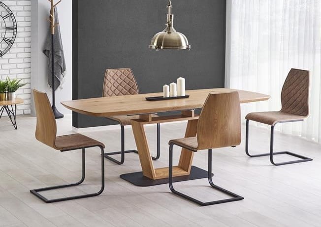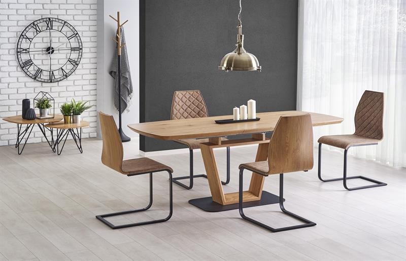 Elegancki stół o silnej formie - silnie determinuje jego charakter. Na uwagę zasługuje stabilna podstawa konstrukcji ze stali malowanej proszkowo, wytworna, nowoczesna forma, a także nieszablonowa kolorystka, gdzie łączy się dąb złoty z czernią. Blat wykonany z pięknej, laminowanej płyty MDF. To sprawia, że świetnie się prezentuje. Jednocześnie łatwo jest utrzymać go w nieskazitelnej czystości.