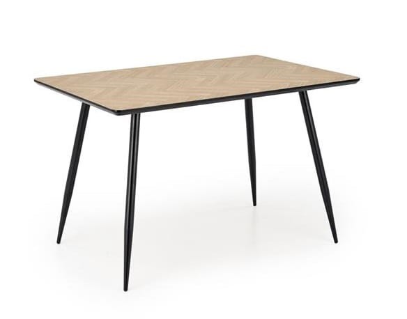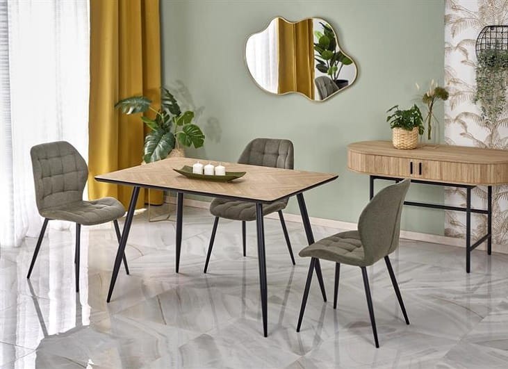 Prostokątny blat wykonany z trwałej płyty MDF w naturalnej okleinie emanuje ciepłem i przyjemnym wyglądem. Dzięki wzorowi imitującemu drewnianą jodełkę, stół Fizzo wyróżnia się oryginalnym designem, który idealnie komponuje się z nowoczesnymi wnętrzami. Wymiary blatu 120x80 cm sprawiają, że stół pomieści całą rodzinę przy wspólnym posiłku, nie zajmując przy tym zbyt wiele miejsca.