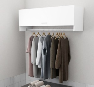 Szafka wisząca Vittoria z wieszakiem wykonana została z laminowanej płyty meblowej w kolorze białym, dzięki czemu wnosi w pomieszczenie, w którym się znajduje, sporo światła i higienicznej jasności. Za podnoszonymi drzwiczkami, zaopatrzonymi w mechanizm blokujący w pozycji otwartej, znajdują się dwie obszerne półki, na których przechowywać możemy złożone w kostkę ręczniki, pojemniki z preparatami kosmetycznymi, suszarkę do włosów czy lokówkę - jeśli powiesimy ją w łazience. Wspomniany wyżej drążek umożliwia powieszenie kilku wieszaków z ubraniami, co niewątpliwie jest praktycznym rozwiązaniem szczególnie, gdy Vittorię umieścimy w naszej garderobie.