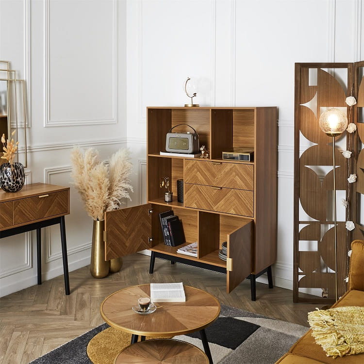 Przedstawiamy wyjątkowy regał z szufladami retro Feliks - mebel, który idealnie łączy w sobie funkcjonalność z ponadczasowym designem inspirowanym stylistyką vintage. Ten przemyślanie zaprojektowany regał przyciąga wzrok charakterystycznym wzorem jodełki na frontach, wprowadzając do wnętrza element wyrafinowanej elegancji i nostalgicznego uroku.