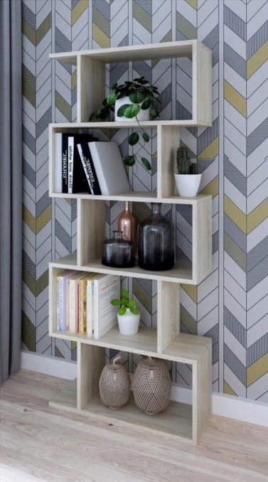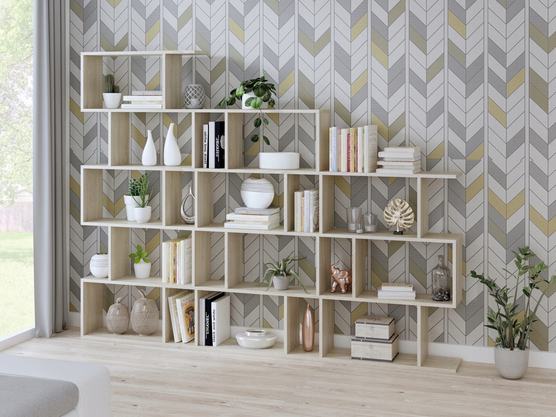 A to za sprawą interesująco zaprojektowanych półek. Ten wysoki na 176 cm regał na książki, zdjęcia, pamiątki i inne drobiazgi, które dzięki licznym półkom znajdą swoje miejsce - ma przemyślany, fantastyczny design. Z pozoru prosty, wyróżnia się jednak asymetrycznym rozstawem półek, niezwykle ciekawym. Na Państwa uwagę zasługuje faktura tego mebla. Do jego wykonania wykorzystano laminowaną płytę meblową - w kolorze dąb sonoma. Piękną, a zarazem prostą w utrzymaniu. Do regularnej pielęgnacji wystarczy wilgotna ściereczka.