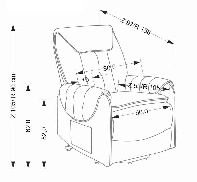 - Wymiary: szerokość - 80 cm, głębokość - 97÷158 cm, wysokość - 105 cm, wysokość siedziska - 52÷53 cm