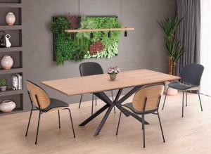 Stół rozkładany Mavery wykonany został w stylu industrialnym. Połączenie czarnego metalu z naturalnym dębem blatu pozwala wykorzystać mebel w każdej nowoczesnej aranżacji salonu, jadalni lub sali konferencyjnej, ze szczególnym uwzględnieniem modnego od kilkunastu lat stylu loftowego. Doskonale prezentował się będzie na tle mebli z elementami o podobnej fakturze drewna, opartymi na metalowych konstrukcjach.