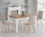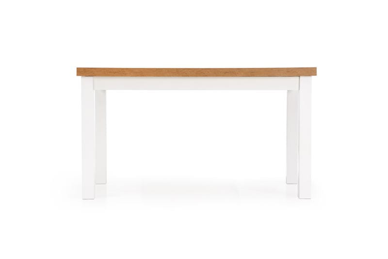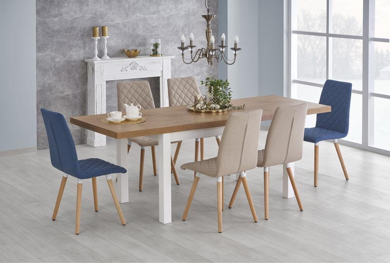 Nogi stołu wykonane są z litego drewna bukowego, prostokątny blat w odcieniu "dąb lancelot" to najwyżej jakości MDF laminowany. Jest on odporny na uszkodzenia i zarysowania, niewymagający w kontekście utrzymania czystości. Połączenie białej konstrukcji i naturalnego wybarwienia blatu perfekcyjnie wpisuje się w nurt Hygge, w którym jasne, ciepłe kolory, kreują przyjemną atmosferę wnętrza. W podstawowej wersji stół ten ma wymiary 140 cm x 80 cm. Po rozłożeniu jego długość zwiększa się aż do 220 cm!