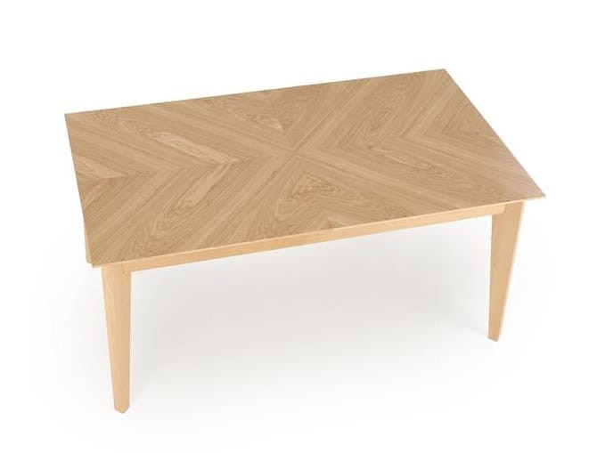 Blat stołu to prawdziwe dzieło sztuki stolarskiej. Wykonany z naturalnej okleiny dębowej, zachwyca precyzyjną intarsją, która nadaje mu unikalny charakter. Stół Mondo to połączenie trwałości i elegancji. Jego konstrukcja oparta jest na solidnej płycie meblowej, gwarantującej stabilność i długowieczność. Naturalne bukowe nogi nie tylko zapewniają doskonałe podparcie, ale także dodają meblowi ciepła i autentyczności.