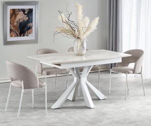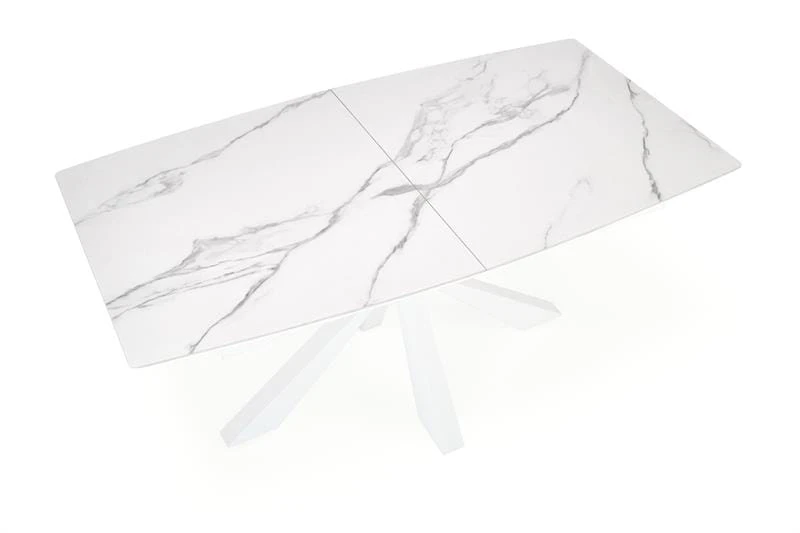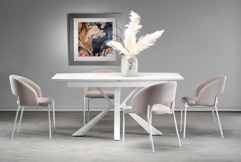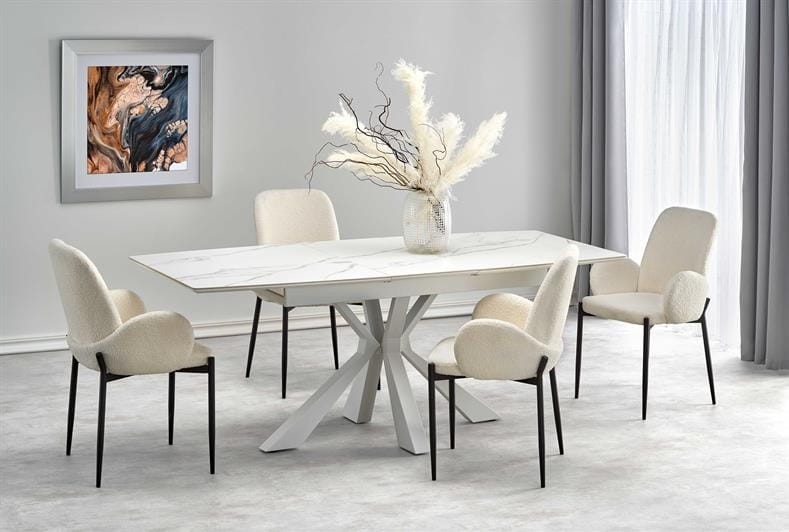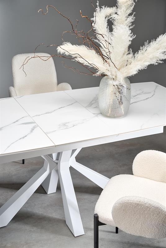Gładki blat stołu, imitujący biały marmur, to hołd dla tradycji i jednocześnie definicja luksusu. Wyraźnie zaznaczone wzory marmurowe dodają temu modelowi autentycznego charakteru, a jego harmonijny kształt wprowadza do pomieszczenia balans i wyrafinowanie. Ale to nie wszystko! Interesująco zaprojektowane nogi o geometrycznych, krzyżujących się liniach nadają stołowi Fresco nowoczesnego sznytu, łącząc w jednym meblu dwie epoki.