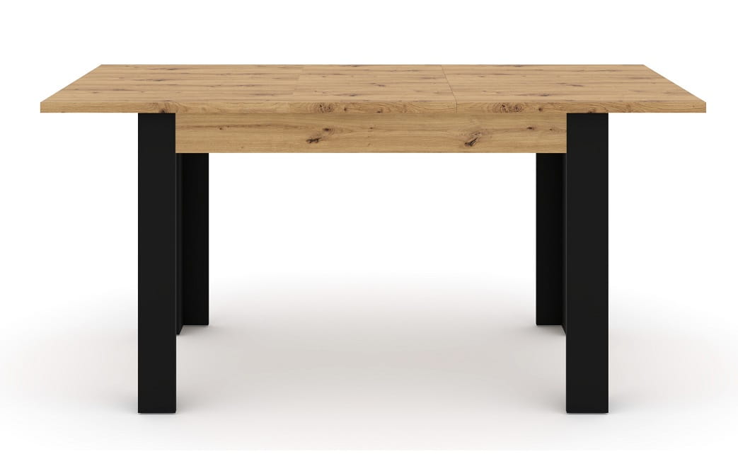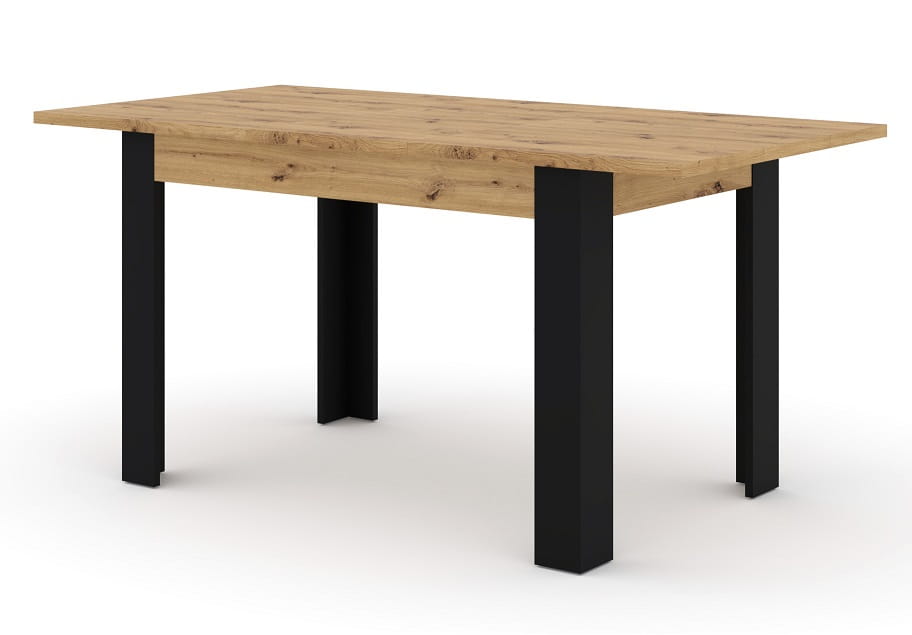 Rozkładany stół jest niezwykle przydatny, jednak na uwagę zasługuje również jego bezpretensjonalny, świetny design. Mamy tu typowy dla loftoweggo stylu drewniany blat z widocznym, pięknym usłojeniem w kolorze dębu artisan. Ale sznytu nadają mu duże, czarne nogi w macie, kontrastujące z resztą konstrukcji.