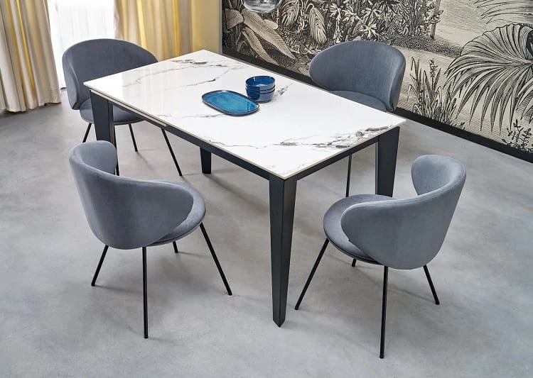 Prawdziwa magia tego stołu kryje się w jego wszechstronności. W codziennym użytkowaniu zachwyca kompaktowymi rozmiarami, doskonale wpisując się w przestrzeń nowoczesnej jadalni. Jednak w mgnieniu oka może przemienić się w reprezentacyjny mebel goszczący nawet kilkunastoosobowe towarzystwo podczas świątecznych spotkań czy rodzinnych celebracji. Ta transformacja nie wymaga wysiłku dzięki przemyślanemu mechanizmowi rozkładania. Doskonałą opcją jest też fakt, że stół rozsuwa się razem ze stelażem, dzięki czemu zwiększa się także przestrzeń na krzesła a nie tylko sam blat.