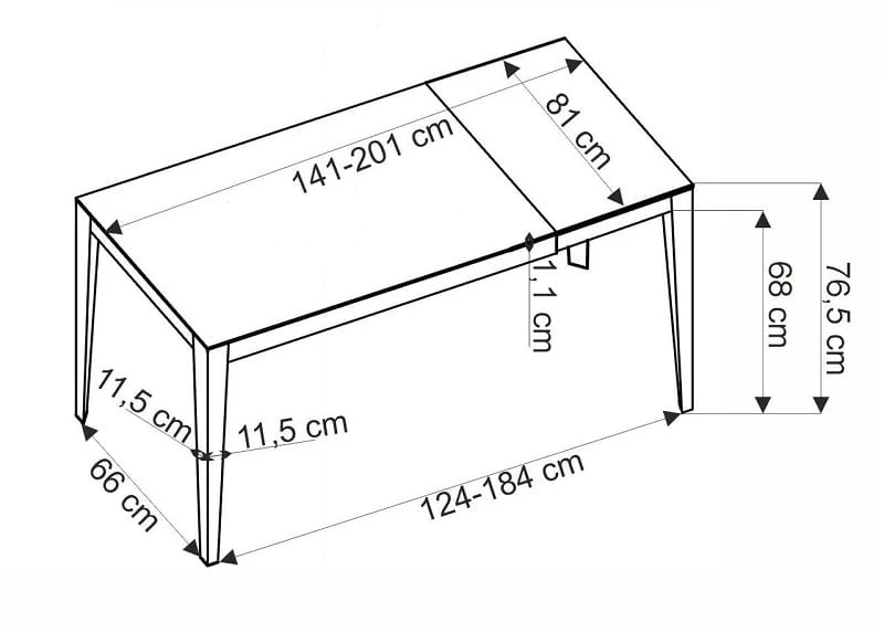 - Wymiary: wysokość - 76 cm, szerokość - 141÷201 cm, głębokość - 81 cm, rozstaw nóg - 124-184 cm