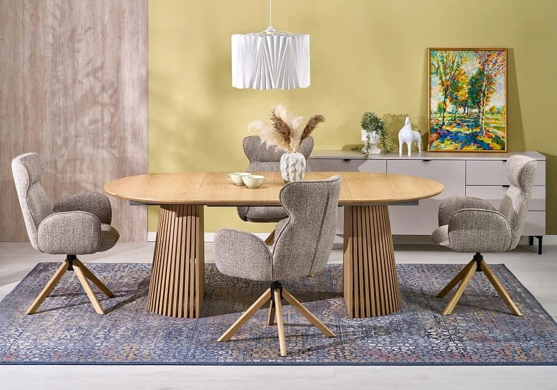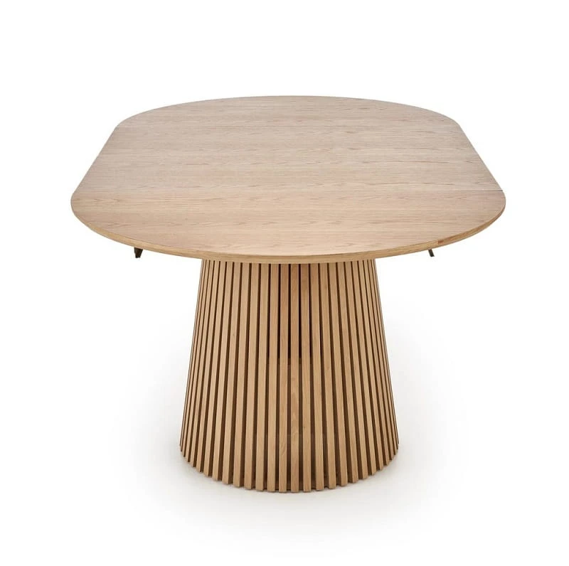 Ten wyjątkowy okrągły rozkładany stół został zaprojektowany z myślą o nowoczesnych domach, gdzie przestrzeń musi być wykorzystana mądrze, a każdy mebel powinien służyć wielu celom. Standardowa średnica 120 cm to idealne wymiary dla codziennego użytkowania - wystarczająco przestronna dla rodziny, ale nie przytłaczająca w mniejszej jadalni. Prawdziwa magia zaczyna się jednak, gdy potrzebujesz więcej miejsca - dzięki intuicyjnemu mechanizmowi rozsuwania możesz zwiększyć długość blatu aż do imponujących 210 cm, co oznacza wygodne miejsce dla nawet 8-10 osób. Blat wykonany z wysokiej jakości MDF-u pokrytego naturalną okleiną łączy w sobie trwałość z autentycznym pięknem drewna. Ciepły, naturalny odcień wprowadza do wnętrza przytulność i harmonię, jednocześnie zapewniając powierzchnię odporną na codzienne użytkowanie. Nie musisz się martwić o ślady czy zarysowania - ten stół został stworzony z myślą o intensywnym użytkowaniu przez lata.