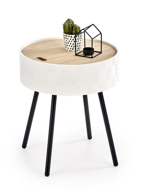 Okrągły stolik kawowy Elsa z pojemnikiem to trafna odpowiedź dizajnerów na zapotrzebowanie osób, którym zleży na ładzie, komforcie i estetyce! Mały stolik kawowy pełni funkcję podręcznego blatu. Można nań odstawić kubek z ciepłym napojem, lampkę wina, odłożyć tu telefon.