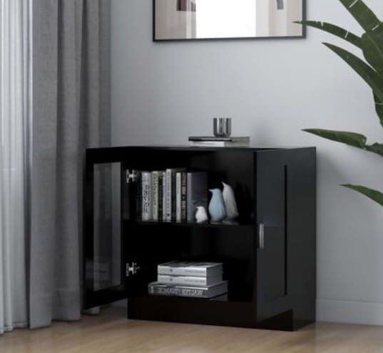 Czarna przeszklona szafka na książki, kieliszki