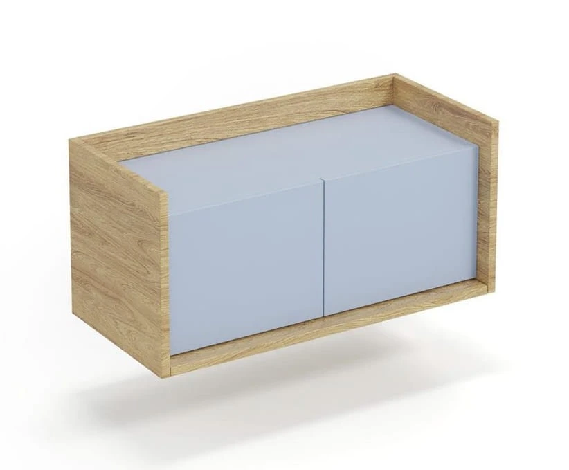 Prezentowany mebel wykonano z wysokiej jakości i solidnej płyty okleinowanej, o niebagatelnej grubości 18 mm. Wyposażony jest on w nowoczesny system otwierania push-click, obrzeża ABS, a jego eleganckie wybarwienie to hikora naturalna oraz niebieski (w ofercie również inne kolory).