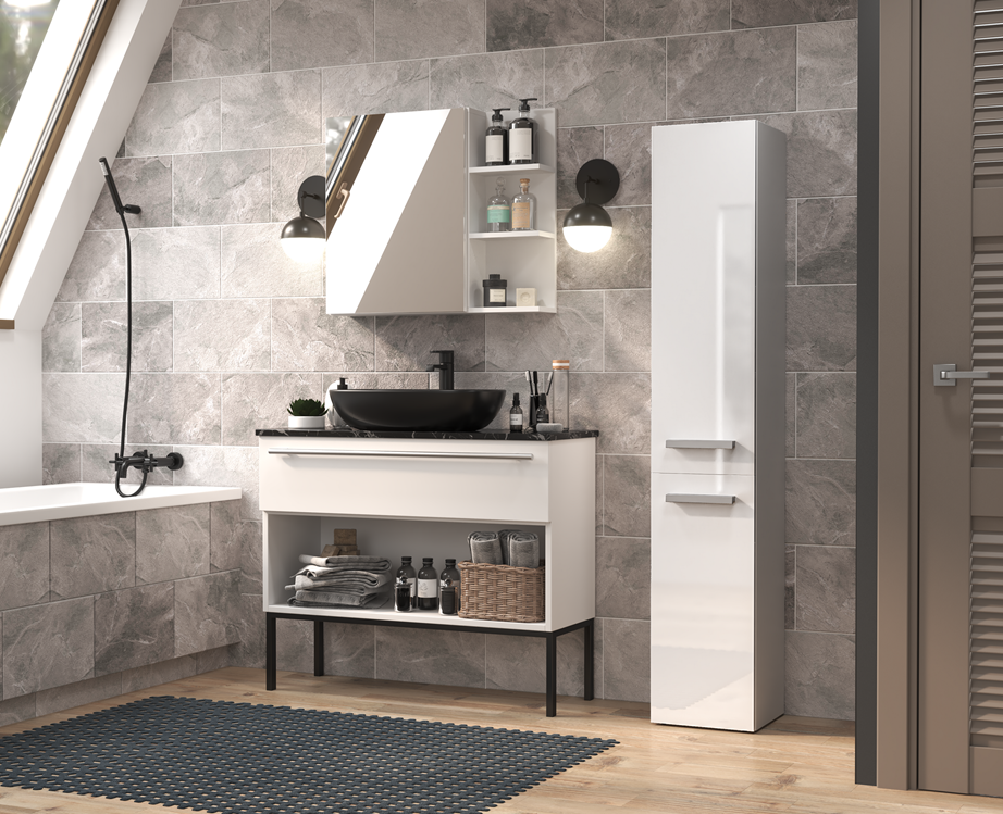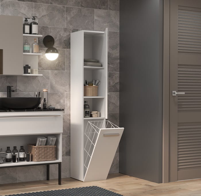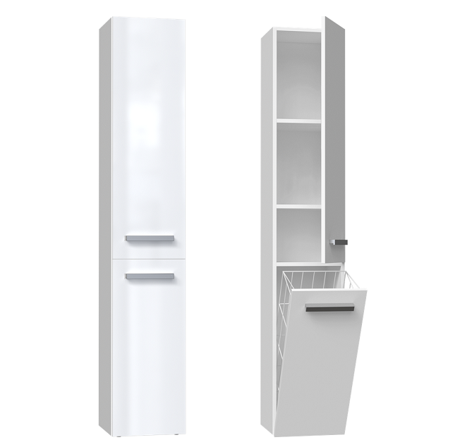 Aby utrzymać porządek w łazience, wymaga ona odpowiedniego zagospodarowania jeśli idzie o miejsce do przechowywania akcesoriów higienicznych i kosmetyków. Nasz minimalistyczny słupek łazienkowy, wyposażony w długie drzwi oraz pojemny kosz na pranie, to rozwiązanie, które pomoże w utrzymaniu harmonii w pomieszczeniu kąpielowym, nie zajmując przy tym zbyt wiele przestrzeni.