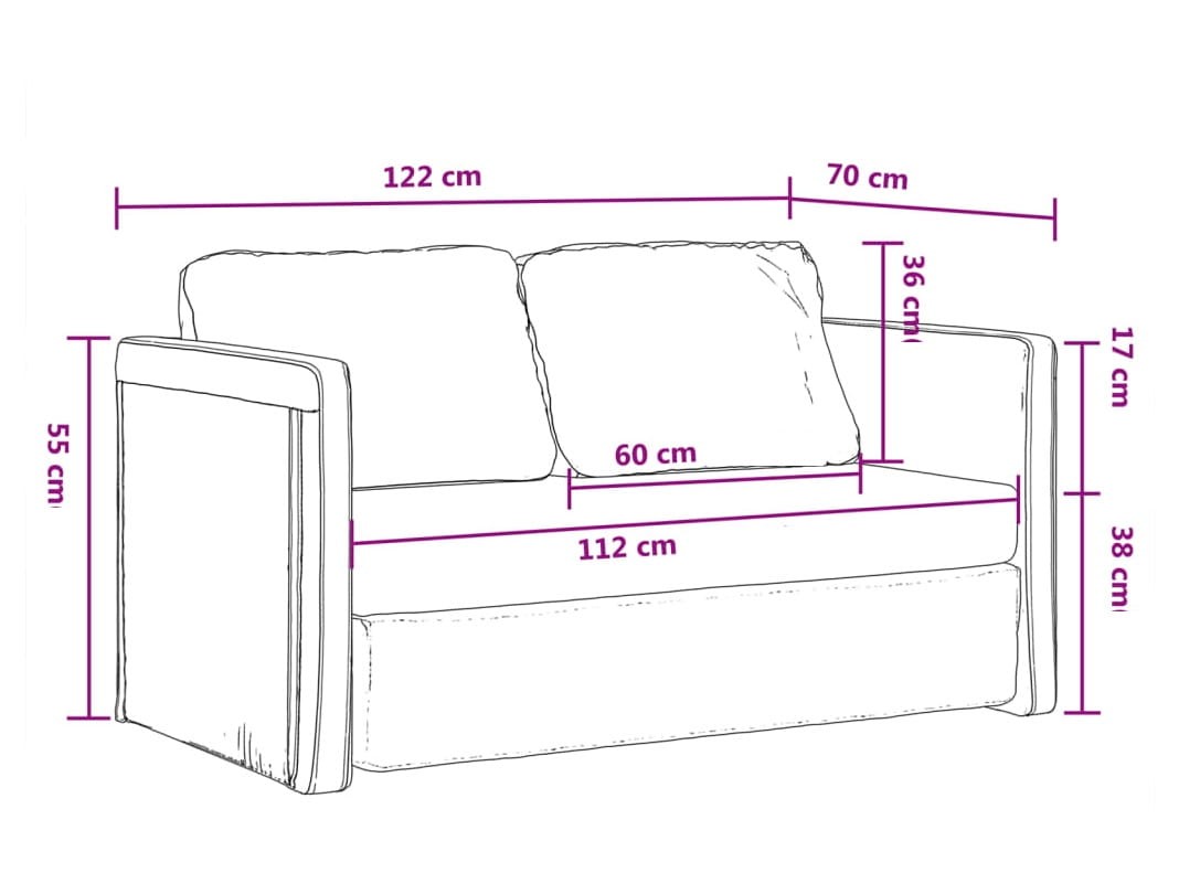 - Sofa podłogowa (po złożeniu): szerokość - 122 cm, głębokość - 70 cm, wysokość - 55 cm, szerokość siedziska - 112 cm, głębokość siedziska - 56 cm, wysokość siedziska nad ziemią - 38 cm, wysokość podłokietników nad ziemią - 55 cm