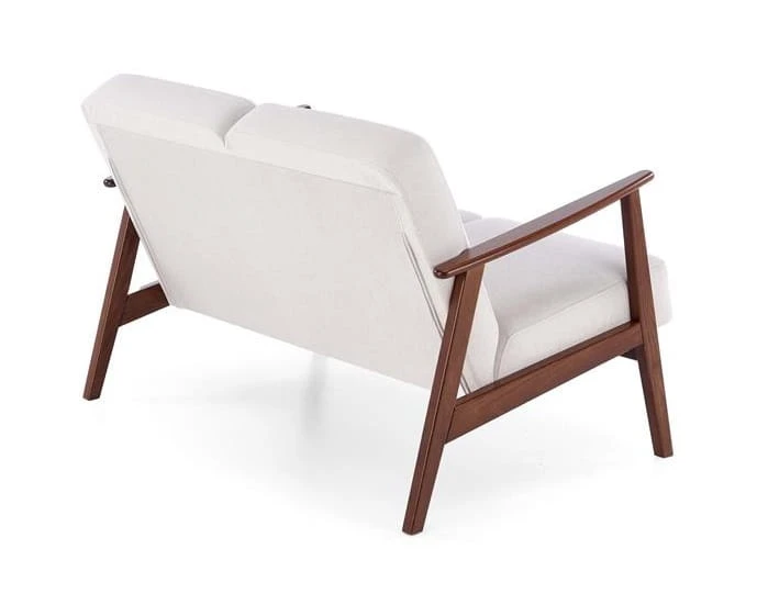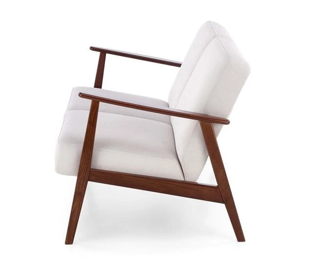Sofa retro FOX II to fantastyczne rozwiązanie do kameralnych wnętrz, gdzie liczy się zarówno wysoka estetyka, jak i komfort użytkowania. Jej komfortowa tapicerka wykonana z wysokiej jakości tkaniny CASTEL w kolorze jasnobeżowym harmonijnie koresponduje z drewnianymi, bukowymi nóżkami w odcieniu ciemnego orzecha, tworząc wyrafinowaną, a przy tym subtelną kompozycję.