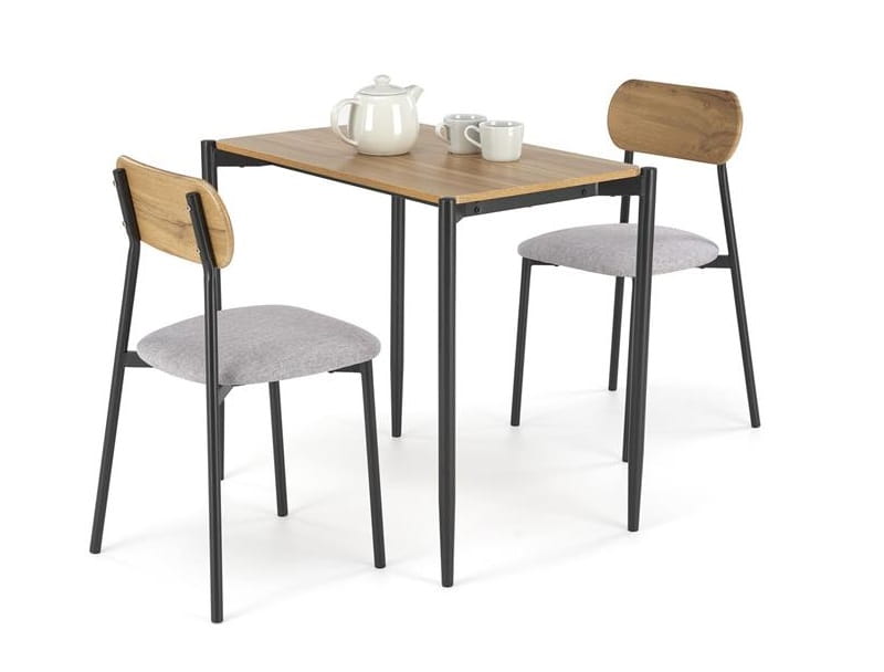 Stół Dandy wyróżnia się minimalistycznym designem, który łączy deseń naturalnego drewna na blacie z eleganckimi, czarnymi nogami. Taka estetyczna kompozycja z łatwością dopasuje się do każdego wnętrza, nadając mu nowoczesnego i stylowego wyglądu. Funkcjonalność tego zestawu sprawia, że będzie on idealnym rozwiązaniem zarówno do małych kuchni, jak i przytulnych jadalni.