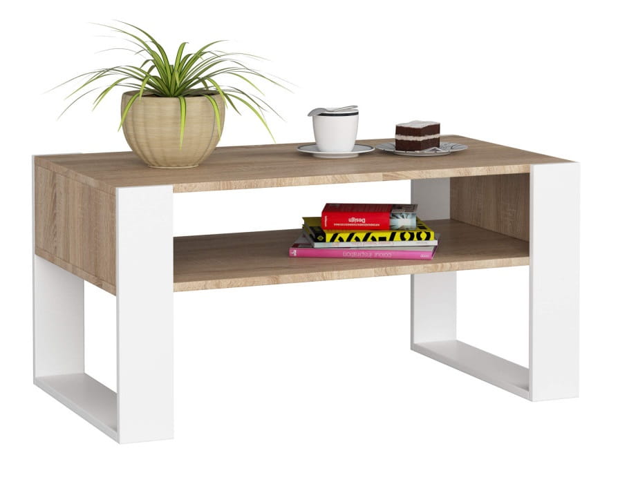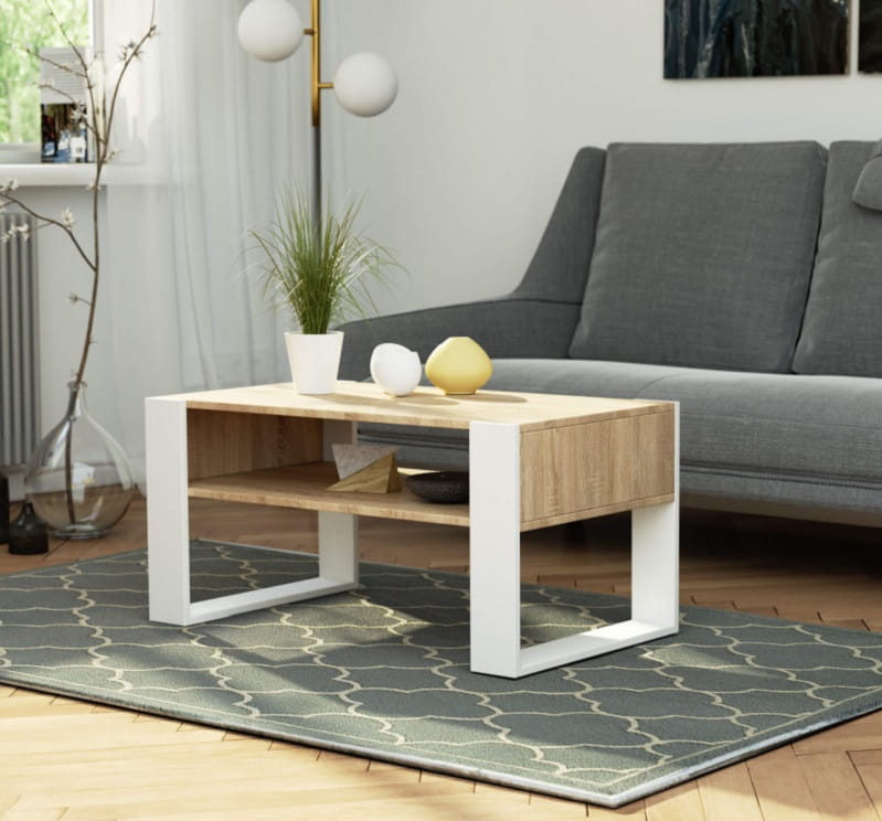 Ława kawowa o wymiarach 92x53x45 cm w kolorze dąb sonoma, z białymi nogami - to harmonijne połączenie elegancji i praktyczności wyrażanej w codziennym stylu życia, gdy przychodzi czas na wypoczynek przy kawie lub herbacie i ulubionej lekturze. Praktyczne wymiary blatu zapewniają komfort użytkowania. Dodatkowa półka umieszczona pod blatem zwiększa możliwości użytkowania, pozwalając na przechowywanie podręcznych akcesoriów, zarówno przy spożywaniu ciepłego napoju, jak i podczas pracy z laptopem.