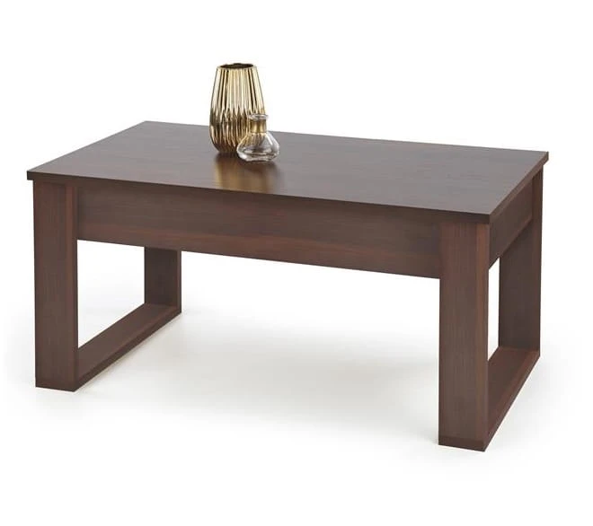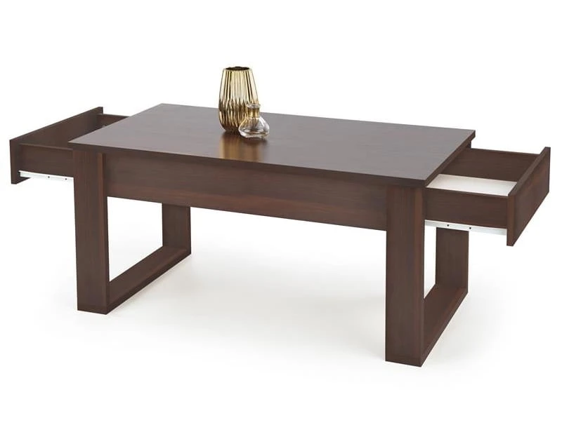 Ławę z szufladami wykonano z laminowanej płyty meblowej, a jej ponadczasowy deseń, imitujący drewno, w kolorze ciemnego orzecha nadaje mu naturalnego, ciepłego wyglądu. To właśnie ten efekt sprawia, że ten prostokątny stolik staje się urokliwym dodatkiem, który wprowadzi do wnętrza atmosferę przytulności i elegancji.