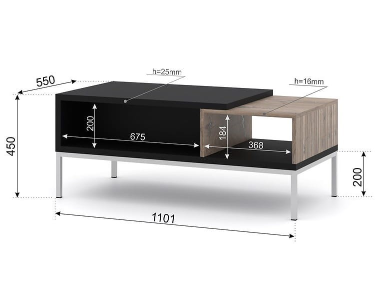 - Materiał: korpus: płyta laminowana 16 mm (dąb), płyta laminowana 25 mm (czarna), front : płyta MDF 16 mm, nóżki: metal