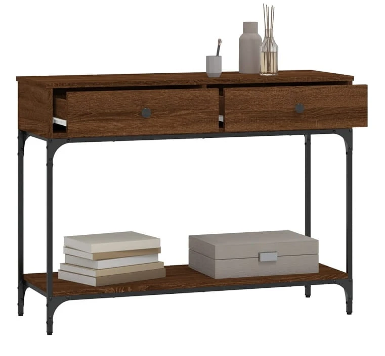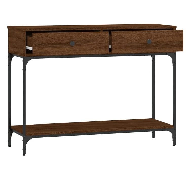 Dwie szuflady pod górnym blatem, z czarnymi uchwytami, stanowią idealne miejsce na przechowywanie drobiazgów, kluczy czy innych niezbędnych przedmiotów. Funkcjonalność mebla sprawia, że z łatwością utrzymać można porządek we wnętrzu, mając zarazem wszystko co trzeba w zasięgu ręki. Dodatkowym atutem jest blat dolny, który można wykorzystać z pomysłem!