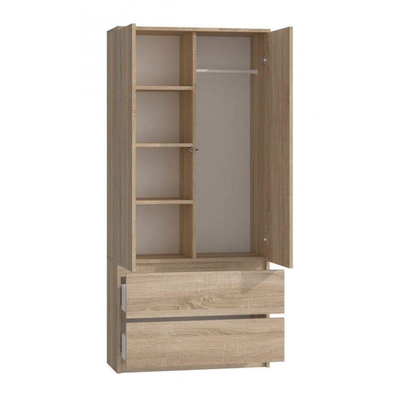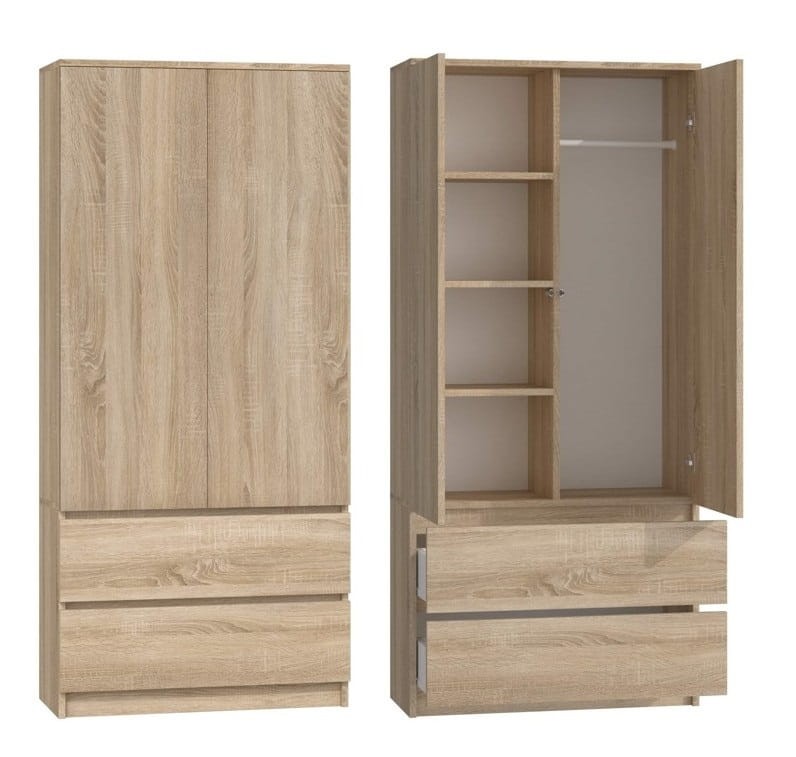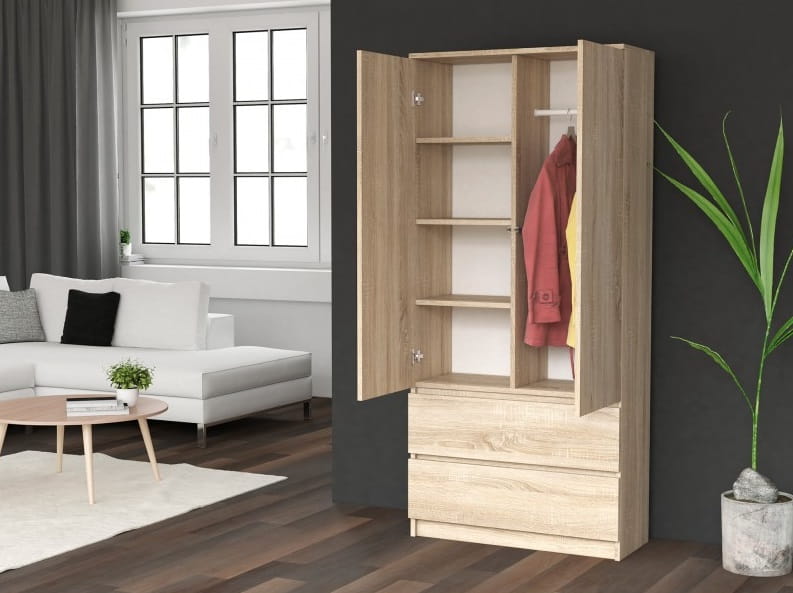 Nasza szafa doskonale sprawdzi się także w biurze - bez problemu pomieści dokumenty, segregatory, pieczątki i inne biurowe niezbędniki. Możesz go także użyć w swojej garderobie. Twoje piękne ubrania będą wyeksponowane na wieszakach oraz półkach i już nigdy nie trzeba będzie ich szukać. Cechy charakterystyczne tego produktu to przede wszystkim solidne wykonanie oraz nowoczesny wygląd. Kolor dąb sonoma dodatkowo podkreśla jego minimalistyczną konstrukcję oraz ożywia każde wnętrze.