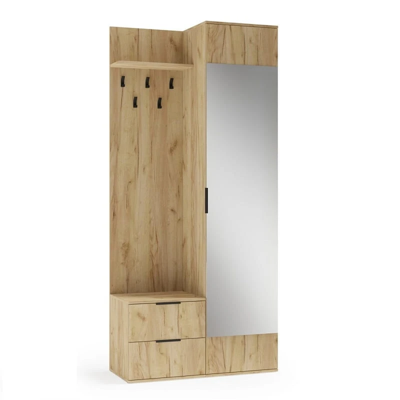 Garderoba Koral zachwyca harmonijnym drewnopodobnym dekorem. Ciepły odcień drewna wprowadza przytulną atmosferę do przedpokoju. Lustrzana powierzchnia nie tylko spełnia funkcję praktyczną, ale również stanowi stylowy element dekoracyjny, który rozjaśnia i optycznie powiększa przestrzeń. Ta garderoba do przedpokoju sprawdzi się doskonale nie tylko w tradycyjnych holach, ale również w tych nowoczesnych czy wąskich. Jej uniwersalny design i neutralna kolorystyka pozwalają na łatwe dopasowanie do różnorodnych stylów wnętrzarskich - od skandynawskiego minimalizmu po nowoczesną klasykę.