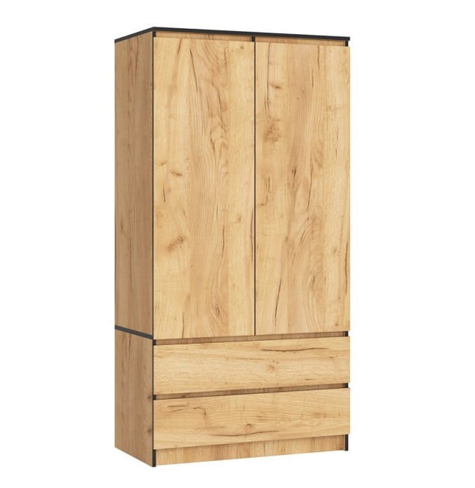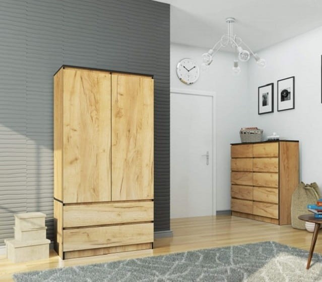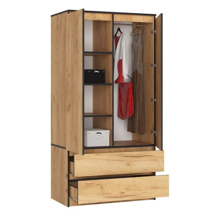 Korpus mebla utrzymany został w całości w kolorze dąb craft. Dolna część szafy to dwie szuflady ułożone równolegle jedna nad drugą, natomiast górny, wyższy segment podzielony został na dwie części. Lewa to rząd 4 półek, natomiast prawa, wyposażona w drążek przeznaczona została na ubrania wiszące.