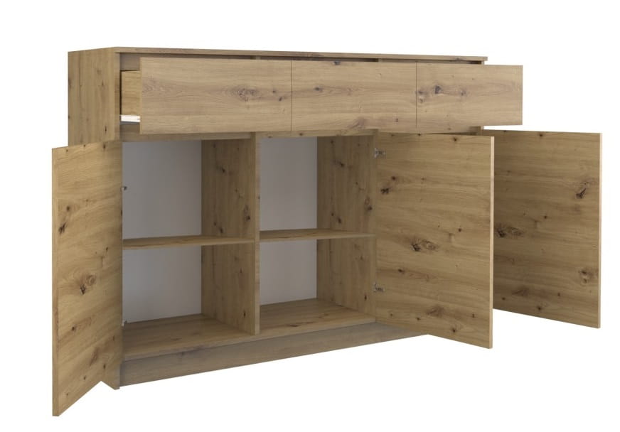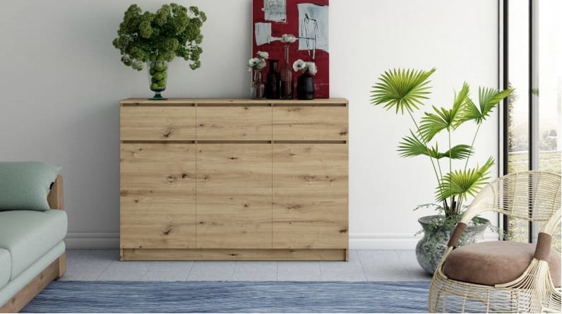 Uniwersalna komoda z serii Romes w kolorze dąb artisan to funkcjonalny i pakowny mebel, który urządzi wnętrze Twojej sypialni, salonu lub pokoju dziecka. Nowoczesny i minimalistyczny wygląd sprosta oczekiwaniom wszystkich, którzy cenią połączenie prostoty i elegancji. Wnętrze komody składa się z półek oraz szuflad, które pomogą przy rozmieszczaniu rzeczy. Łatwiej będzie znaleźć to, czego się szuka.