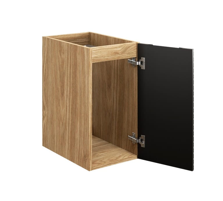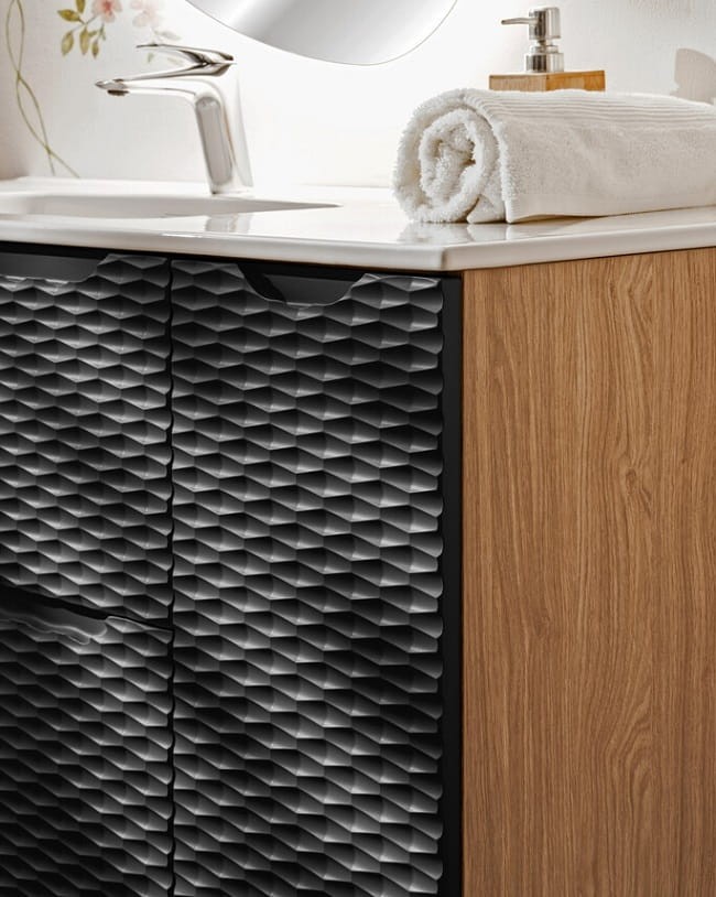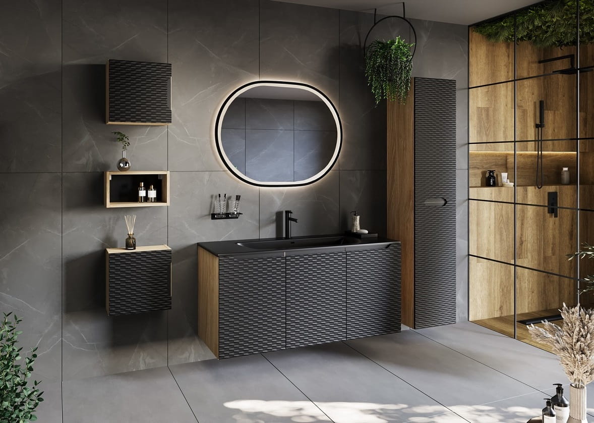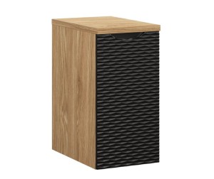 Design szafki zachwyca harmonijnym połączeniem korpusu i blatu w szlachetnym odcieniu olejowanego dębu z czarnym, frezowanym frontem. Charakterystyczny motyw fal morskich, precyzyjnie wykonany na powierzchni drzwiczek, nie tylko nadaje meblowi nowoczesnego charakteru, ale również doskonale wpisuje się w popularną stylistykę loft. Szafka świetnie komponuje się z szafką podumywalkową z tej samej kolekcji, tworząc spójną i funkcjonalną strefę codziennej toalety.