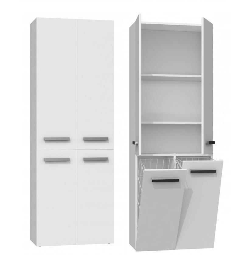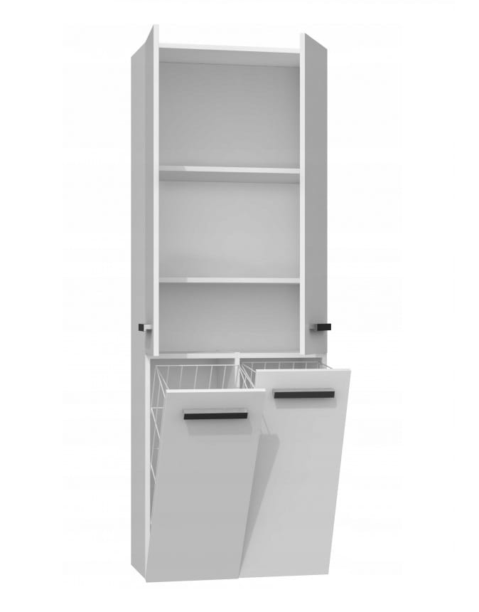 Szafka łazienkowa Mare ma uniwersalny wygląd. To podwójny regał, a każda jego połowa wyposażona jest w zamykane szafki. Sprosta oczekiwaniom tych, którzy cenią sobie prostotę, a przestrzeń do kąpieli i wykonywania codziennych czynności higienicznych - urządzili w minimalistycznym stylu. Przechować w niej można wszystkie niezbędne rzeczy, a oprócz półek wbudowany w nią podwójny jest kosz na pranie!