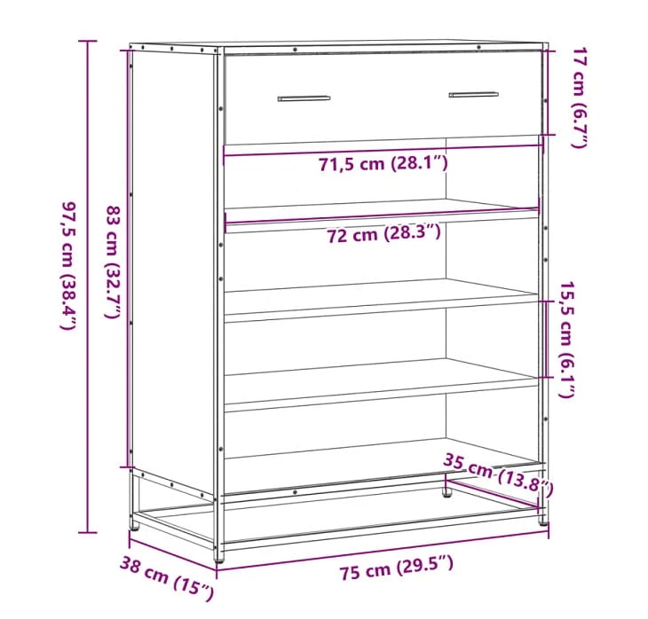 Niewątpliwym atutem stojaka na buty z szufladą Karni jest jego wszechstronność. Cztery przestronne półki pozwalają na uporządkowane przechowywanie obuwia całej rodziny, podczas gdy pojemna szuflada, wyposażona w eleganckie czarne uchwyty, stanowi dyskretną przestrzeń na akcesoria, które wolimy mieć pod ręką, ale niekoniecznie na widoku - czy to będą szczotki do butów, czy klucze do domu. Górna powierzchnia mebla to dodatkowa przestrzeń użytkowa, która sprawdza się zarówno jako miejsce na dekoracyjne dodatki, jak i praktyczna powierzchnia do odkładania na torby czy akcesoria sezonowe. Kompaktowe wymiary (szerokość 75 cm, wysokość 97,5 cm) sprawiają, że szafka doskonale sprawdzi się nawet w niewielkich przestrzeniach, nie przytłaczając wnętrza.
