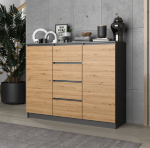 Uniwersalna szafka Isla w kolorze antracyt z dębem artisan to funkcjonalny mebel, który pomoże urządzić wnętrze Twojej sypialni, salonu lub przedpokoju. Nowoczesny i minimalistyczny wygląd sprosta wszystkim, którzy lubią połączenie designerskiego stylu z funkcjonalnością. Wnętrze komody składa się z szuflad i półek, które pomogą w rozmieszczaniu przechowywanych rzeczy. Nasza komoda Isla doskonale sprawdzi się także w biurze. Zmieścisz w niej bez trudu ważne dokumenty i segregatory. Możesz jej także użyć w swojej garderobie. Poskładane w kostkę ubrania znajdą swoje miejsce na półkach szafki.