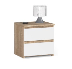 Mała komoda, która może pełnić funkcję szafki nocnej, to znakomity wybór do każdej sypialni. Nie tylko elegancko się prezentuje i łatwo dopasować ją do pozostałych komód czy szaf w pomieszczeniu, ale jest również funkcjonalnym i estetycznym schowkiem na różnego rodzaju drobiazgi. Taka też jest wyposażona w dwie pojemne szuflady szafka nocna Marita, która swój niepowtarzalny urok zawdzięcza uniwersalnemu kolorowi dąb sonoma z białym. To prawdziwa ozdoba każdej sypialni! Wymiary komody dostosowane zostały do wysokości większości łóżek, tak aby korzystanie z niej było zawsze komfortowe i praktyczne.