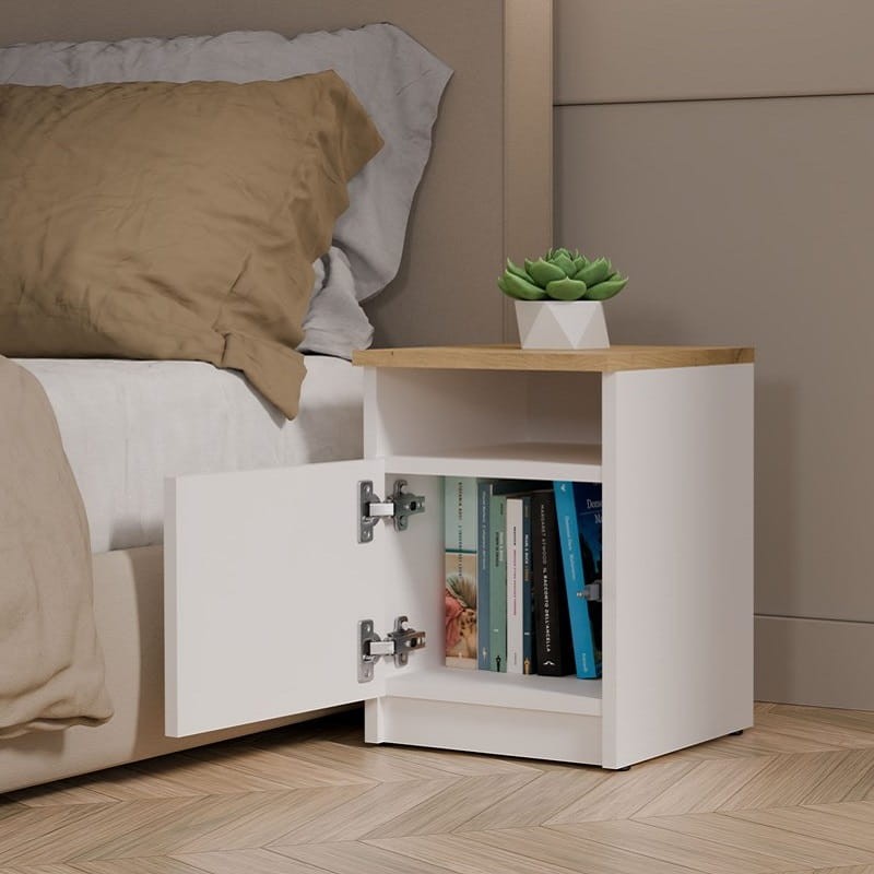 Ten elegancki stolik nocny z szafką oferuje przemyślane rozwiązania dla każdej potrzeby. Otwarta półka pozwala na łatwy dostęp do najczęściej używanych przedmiotów - telefonu, ładowarki czy książki na wieczór. Zamknięta przestrzeń za drzwiami stanie się idealnym miejscem na te rzeczy, które chcesz mieć pod ręką, ale niekoniecznie na widoku. Dzięki temu Twoja sypialnia będzie zawsze uporządkowana, a wszystkie niezbędne drobiazgi znajdą swoje miejsce. Blat szafki to doskonała podstawa pod lampkę nocną, budzik czy dekoracyjne dodatki, które nadają wnętrzu osobisty charakter. Kompaktowe wymiary sprawiają, że ta szafka na lampkę do sypialni nie zajmuje dużo miejsca, jednocześnie oferując maksimum funkcjonalności.