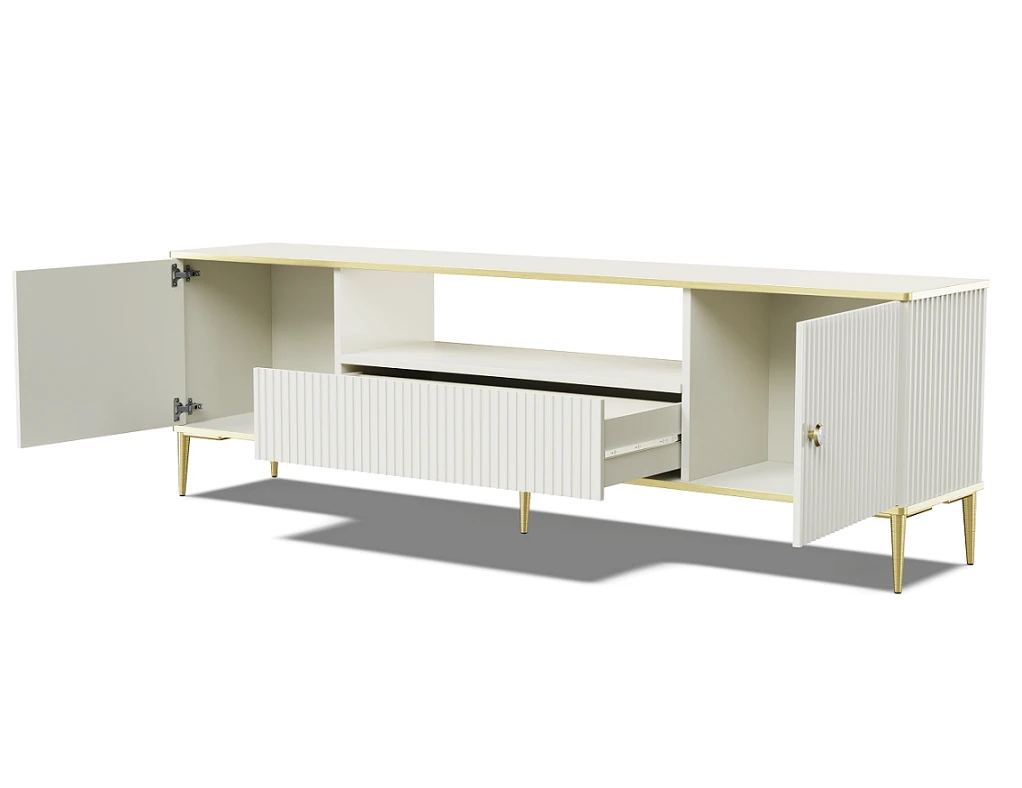 Ta funkcjonalna szafka pod telewizor została stworzona z myślą o praktycznym przechowywaniu sprzętu elektronicznego bez uszczerbku na stylu aranżacji. Otwarta półka zapewnia idealne miejsce na konsolę, dekoder czy inne multimedia. Dodatkowo, pojemna szuflada oraz boczne szafki umożliwiają kameralne ukrycie wszelkich akcesoriów, by zachować porządek w salonie.