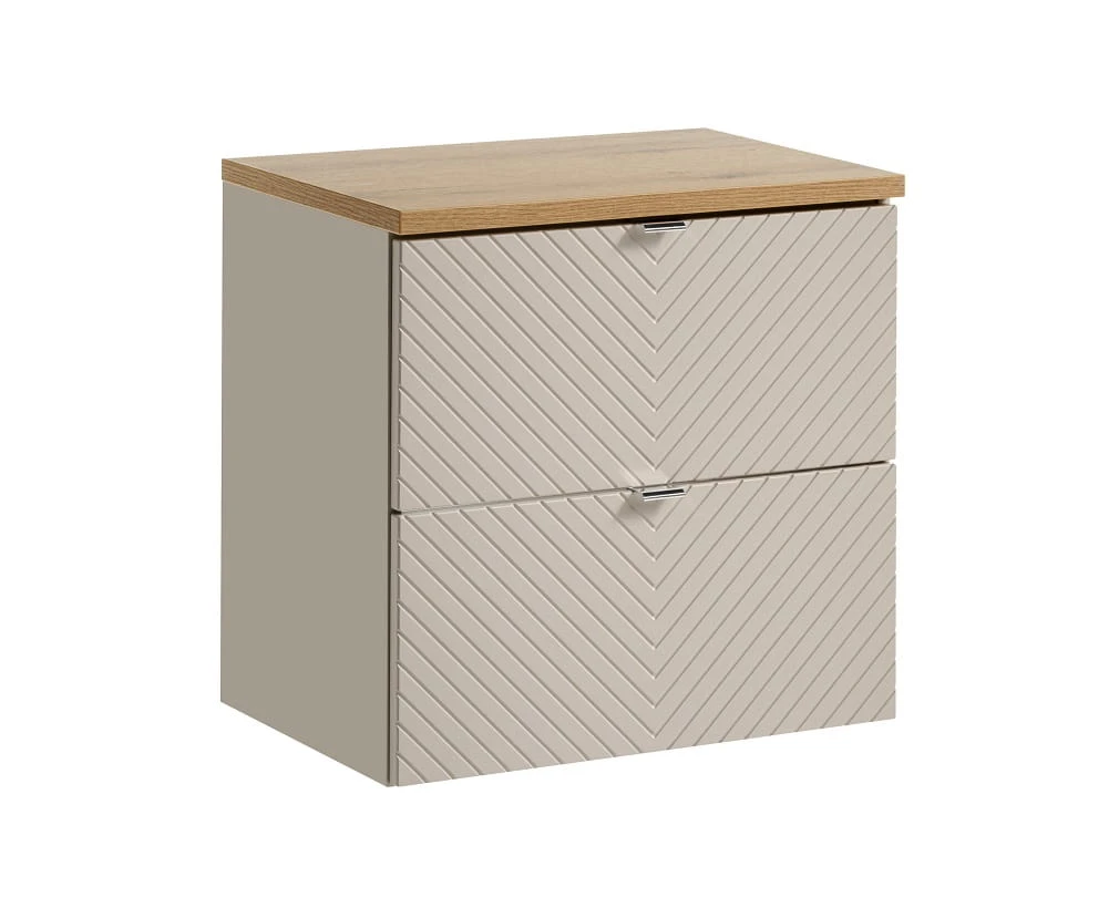 To, co wyróżnia tę szafkę na tle innych modeli, to wyjątkowe wykończenie frontów. Trójwymiarowe, ryflowane wzory w jodełkę, wykonane z wysokiej jakości płyty MDF, tworzą intrygującą grę światła i cienia, dodając meblom ekskluzywnego charakteru. Szafka łazienkowa w kolorze kaszmir doskonale komponuje się zarówno z jasnymi, jak i ciemnymi aranżacjami, stanowiąc uniwersalne rozwiązanie dla różnorodnych stylów wnętrzarskich. Szerokość 60 cm sprawia, że mebel idealnie sprawdzi się w kompaktowych łazienkach, gdzie każdy centymetr przestrzeni jest na wagę złota. Ergonomiczna głębokość szafki została starannie przemyślana, by zapewnić maksimum miejsca do przechowywania przy zachowaniu wygody użytkowania. Pojemne szuflady, wyposażone w system cichego domykania, pomieszczą wszystkie niezbędne kosmetyki i akcesoria łazienkowe, pomagając utrzymać nienaganny porządek.