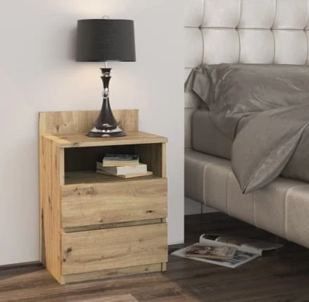 Urządzasz swoją wymarzoną sypialnię i przy łóżku brakuje Ci już tylko szafki, na której będziesz mógł wieczorem odłożyć czytaną aktualnie książkę? Doskonale w tej roli sprawdzi się nasz stolik nocny Merlin II w kolorze dąb artisan. Na blacie jest wystarczająco miejsca na lampkę nocną a także telefon czy okulary. Dodatkowo szafka ma dwie pojemne szuflady, w których również pomieszczą się niezbędne drobiazgi. Kolejnym atutem mebla są wydłużone plecy, dzięki czemu już nigdy nic nie spadnie Ci za szafkę.