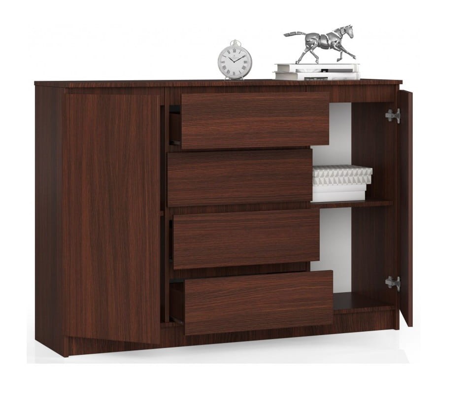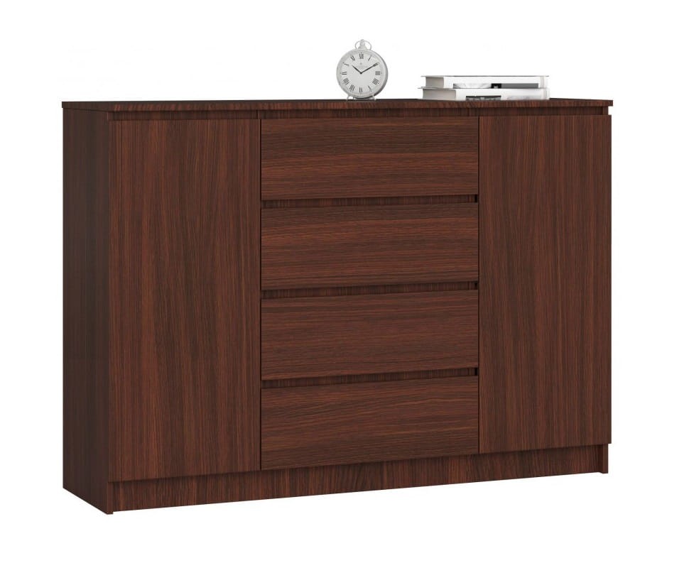 Nasza komoda ma aż 138 cm długości, wyposażona jest w dwie szafki z półką i w cztery praktyczne szuflady. Te poruszają się na innowacyjnych prowadnicach rolkowych, dzięki czemu łatwo się wysuwają i nie generują hałasu. Mebel z płyty laminowanej i zabezpieczony obrzeżami ABS, jest odporny na ewentualne uszkodzenia, a co za tym idzie - wyróżnia się trwałością, co potwierdza długa gwarancja producencka.